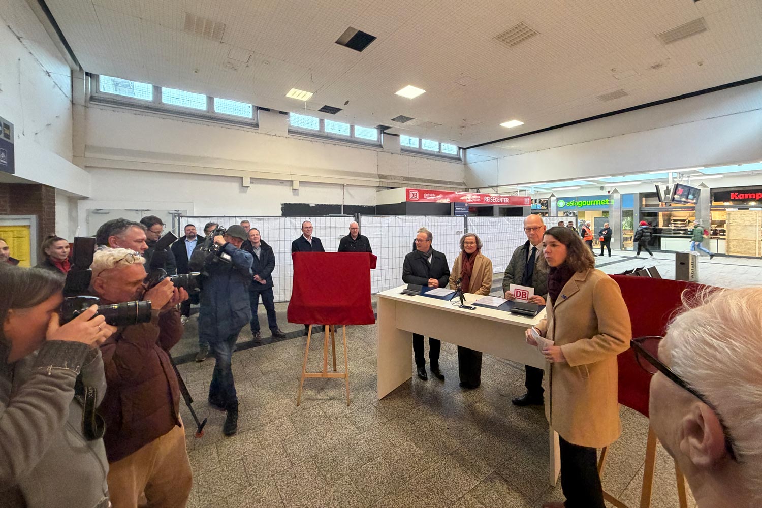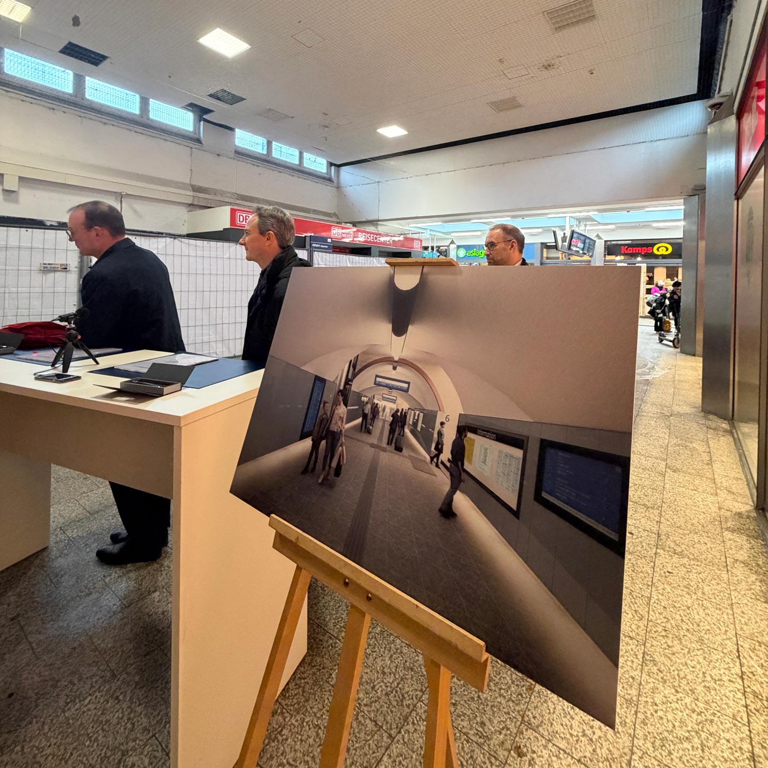 Im Auftakttermin am 12.12.2025 mit der Ministerin für Heimat, Kommunales, Bau und Digitalisierung Ina Scharrenbach, dem Konzernbevollmächtigten der DB Hr. Lübberink, dem Bürgermeister der Stadt Neuss Hr. Breuer, sowie der Bahnhofsmanagerin der Deutschen Bahn Fr. Kosche erfolgt eine feierliche Enthüllung der Renderings und die Vorstellung des Projektes.