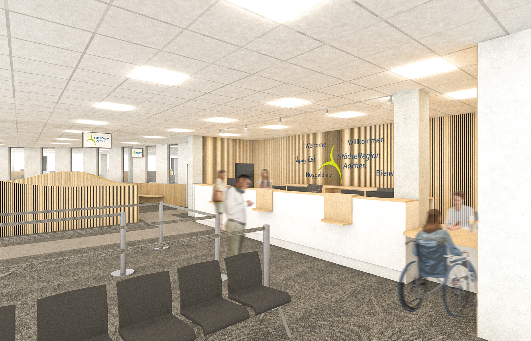 Für die neuen Räumlichkeiten des Ausländeramtes – inklusive eines großzügigen Wartebereichs und moderner Arbeitsplätze – übernahmen wir die Planung der Inneneinrichtung. In enger Zusammenarbeit mit der StädteRegion Aachen wurde ein Gestaltungskonzept entwickelt, das Funktionalität, Orientierung und Aufenthaltsqualität in den Mittelpunkt stellt.